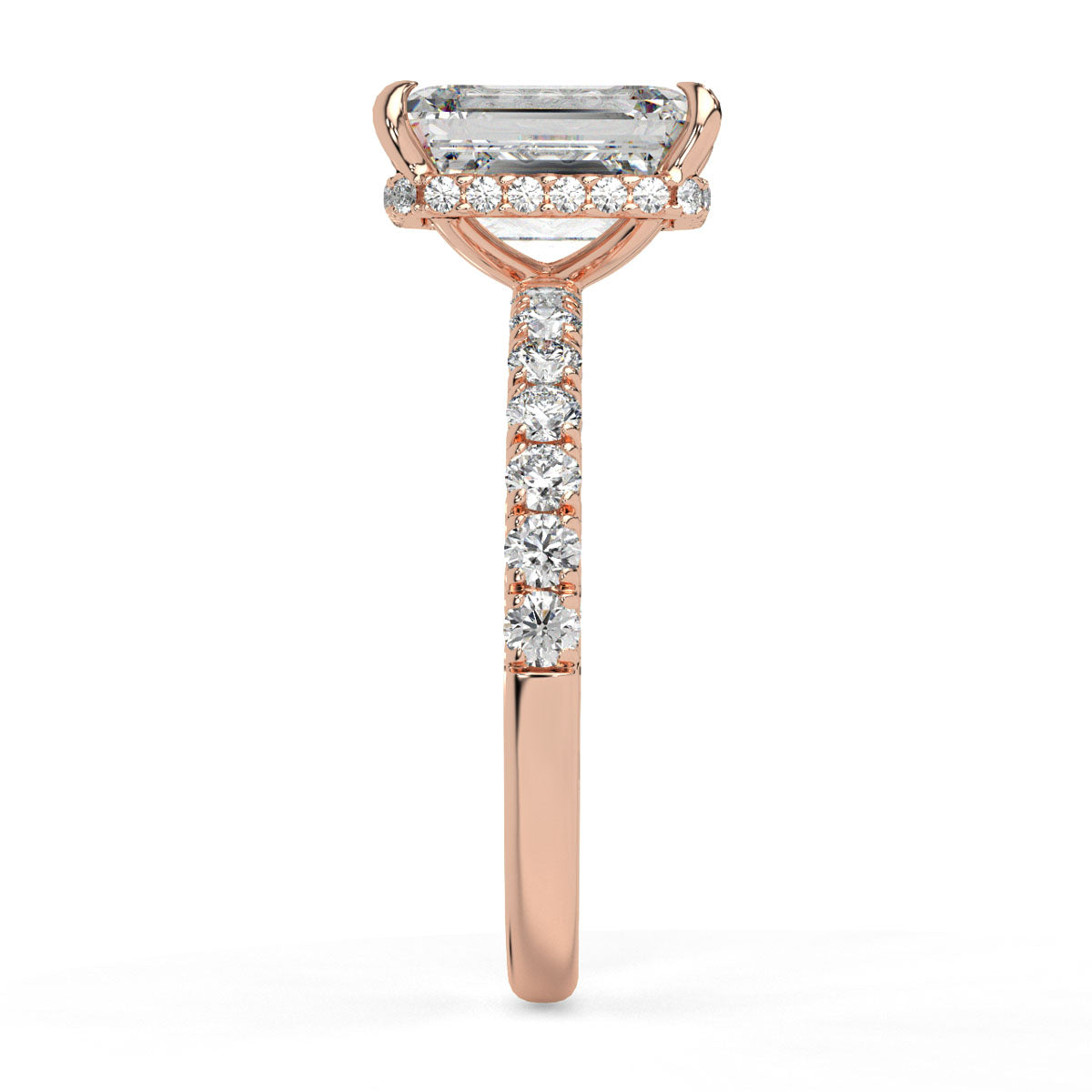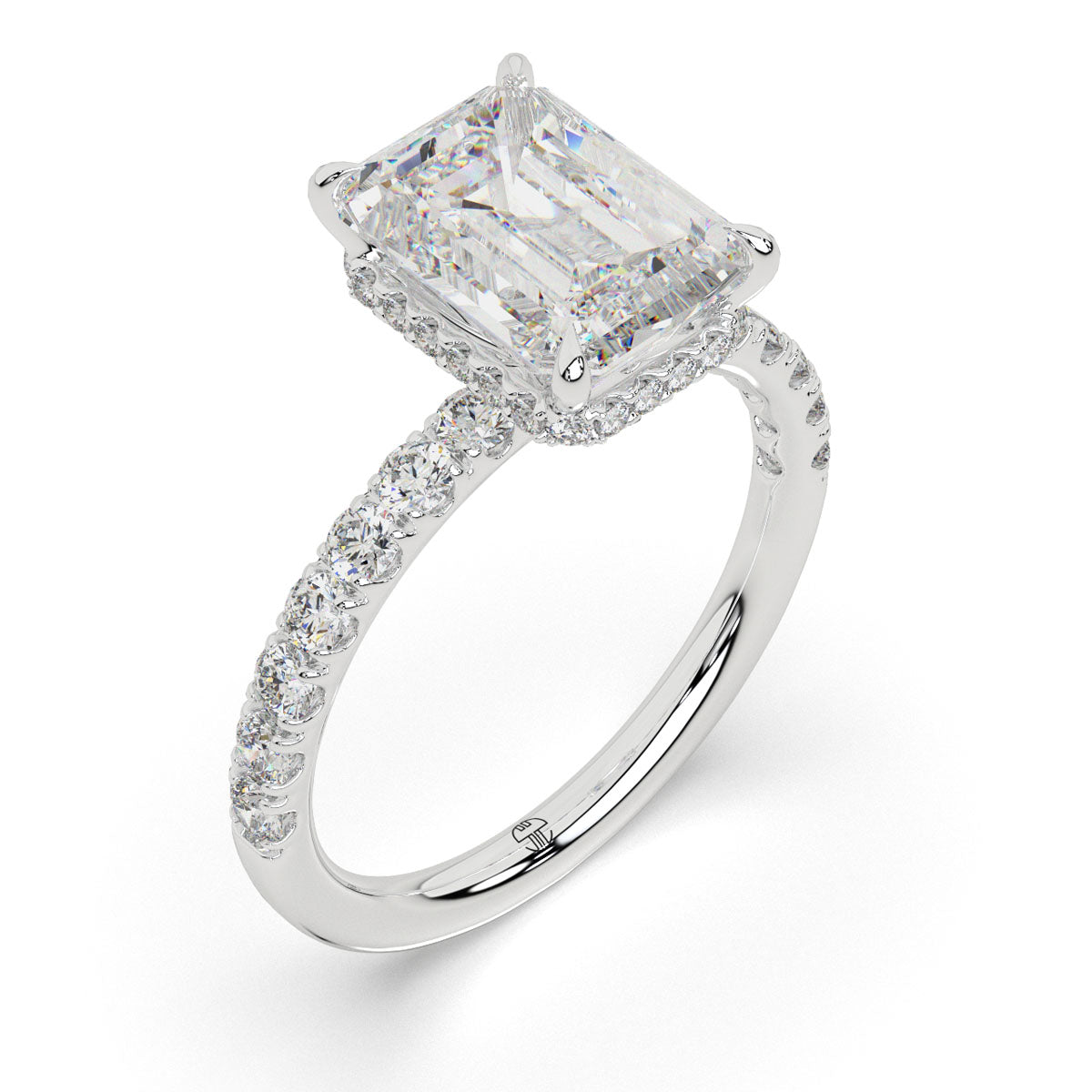 A celebration of timeless elegance. Featuring a striking 2.7 ct lab grown emerald-cut solitaire framed with a delicate hidden halo and accented band, this ring captures sophistication from every angle — graceful, bold, and unforgettable.