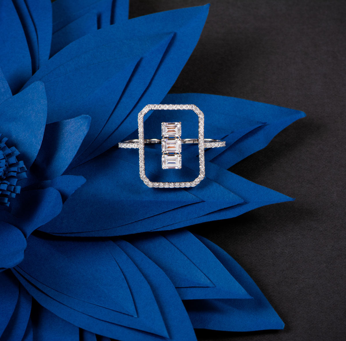 A vision of weightless elegance. Three emerald-cut diamonds appear to hover mid-air, their sharp geometry suspended in light. Encased within a halo of brilliant pavé, the design plays with balance and illusion — delicate yet commanding. More than a ring, it’s a celebration of presence that feels both modern and ethereal.