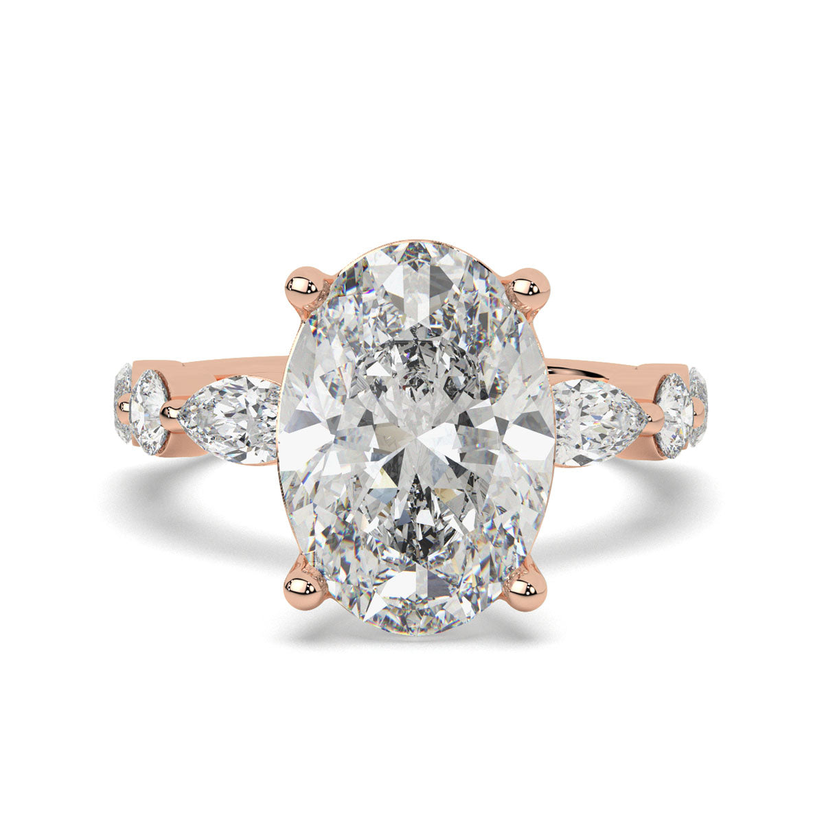 A timeless 3 ct oval solitaire takes center stage, set gracefully on a band that alternates between round and marquise diamonds. The play of mixed shapes adds dimension and sparkle, elevating the elegance of the classic solitaire with a modern twist. This ring is designed for those who love bold simplicity with just the right touch of artistry.