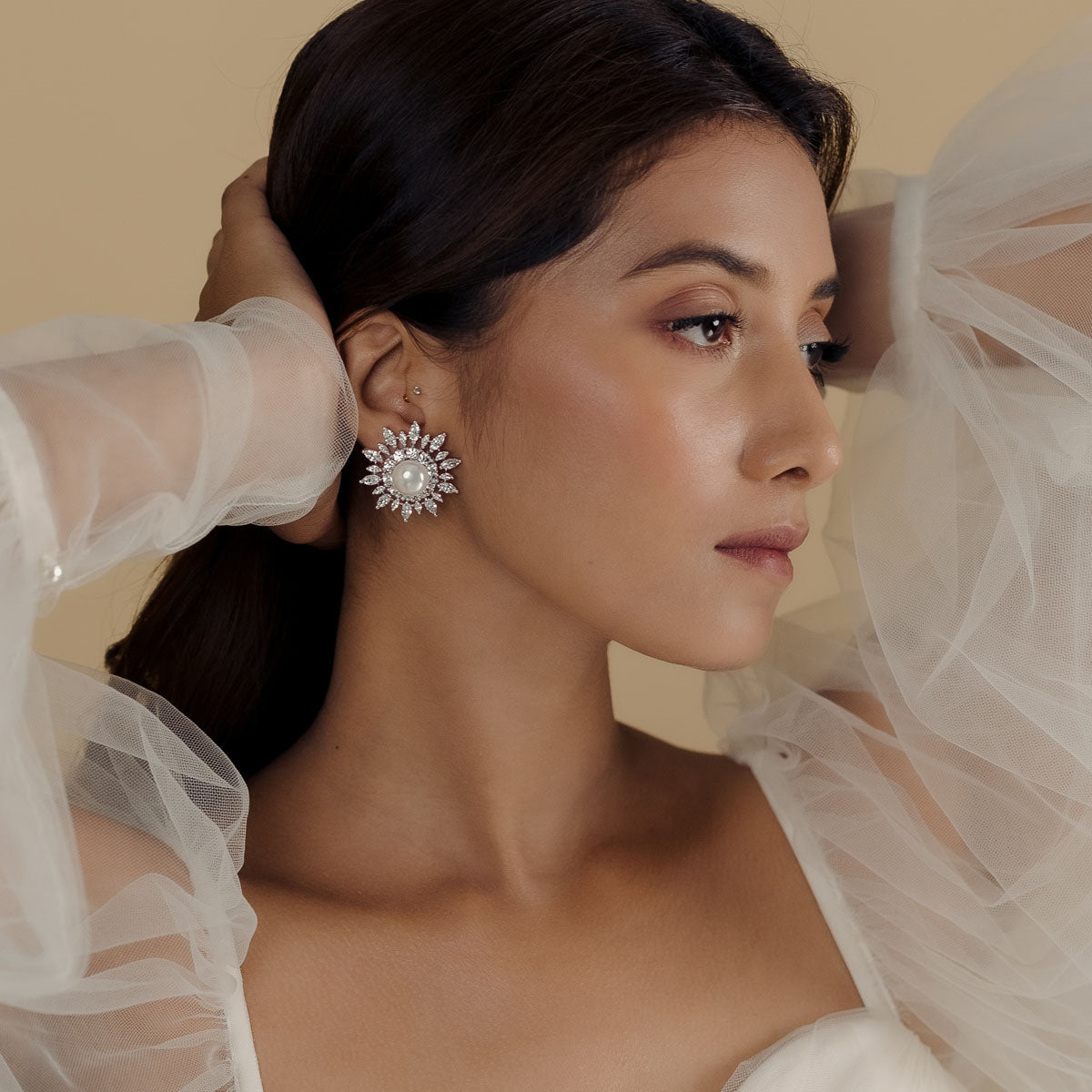 A luminous pearl takes center stage, radiating brilliance in a dazzling sunburst of marquise and round-cut lab-grown diamonds. Bold yet timeless, these statement studs are designed to capture light — and attention — from every angle. Effortlessly elegant, they’re the kind of piece that makes you feel unforgettable the moment you put them on.