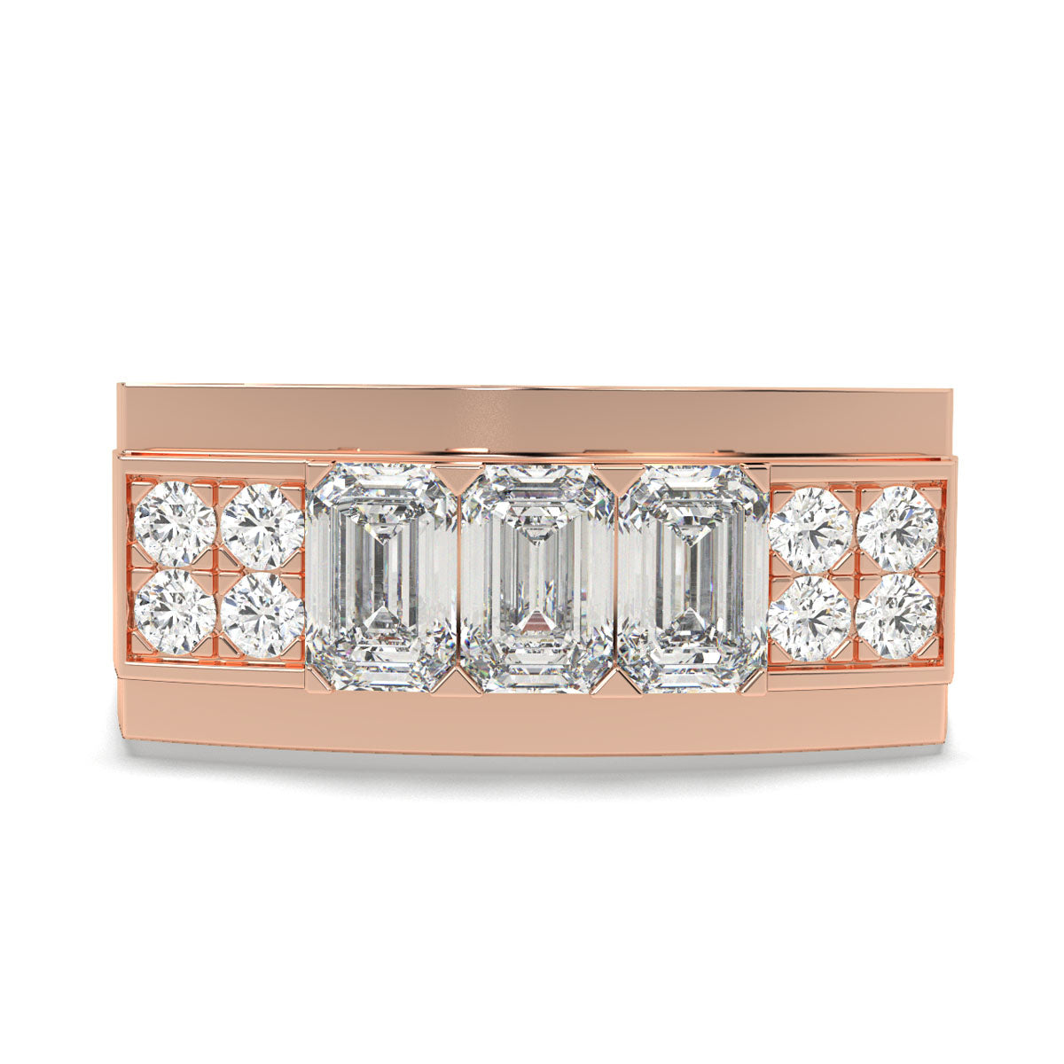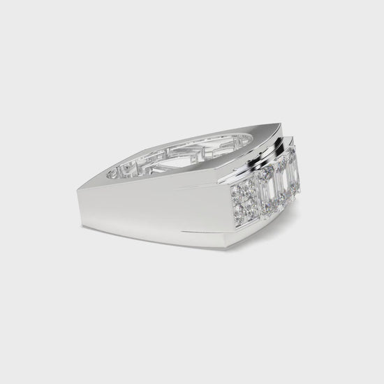 A fortress of brilliance, built on precision and power. Three bold emerald-cut diamonds form the commanding heart, their sharp lines radiating clarity and control. Framed on either side by a regiment of round brilliants, the ring is both architectural and arresting — a seamless union of strength and refinement. More than an adornment, it is a stronghold of presence, crafted for the man who embodies resilience and quiet authority.
