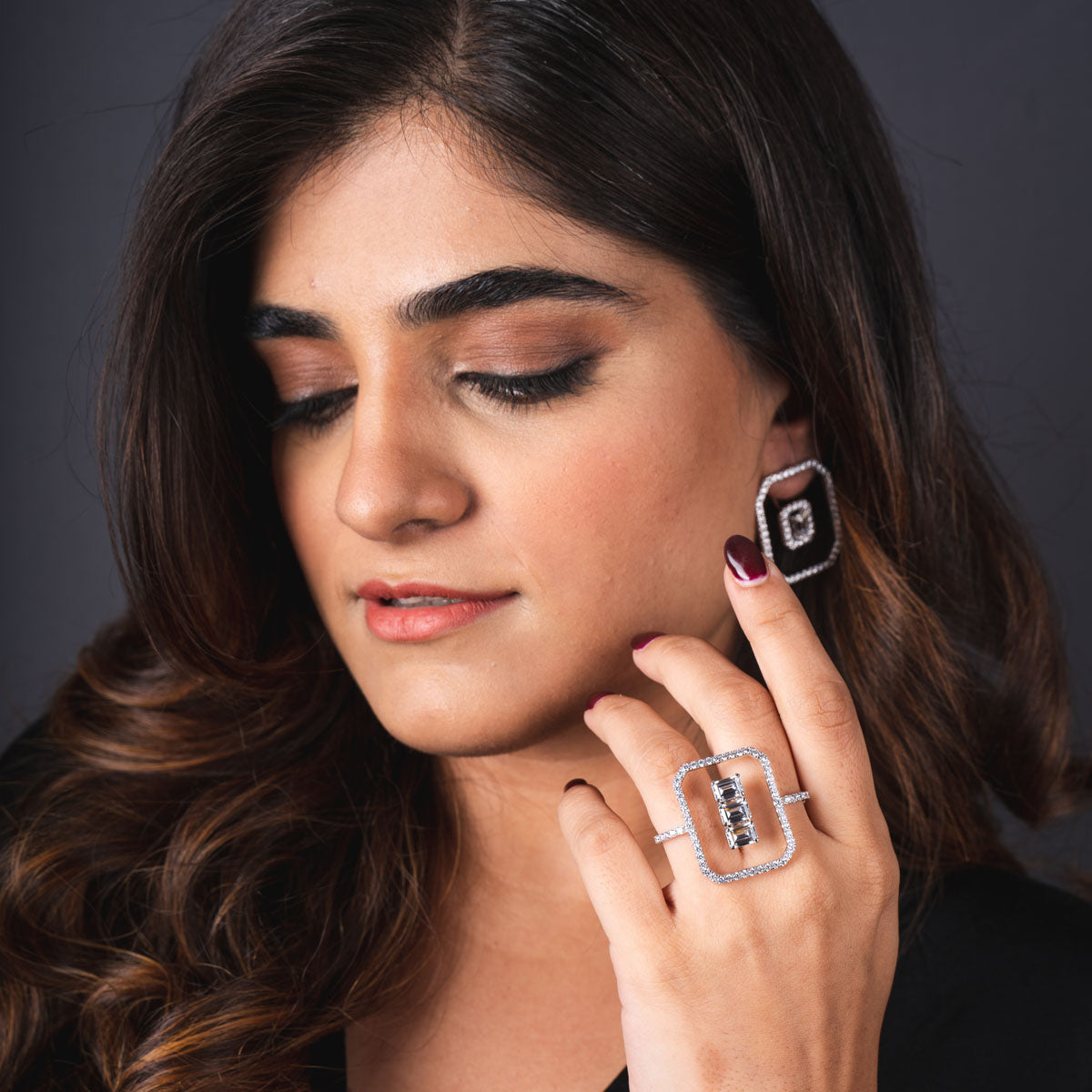 Striking in form and brilliance, these earrings feature a floating emerald-cut diamond framed within bold octagonal halos of pavé brilliance. A modern take on geometry, they blend sharp lines with fluid sparkle for an effortlessly chic statement.
