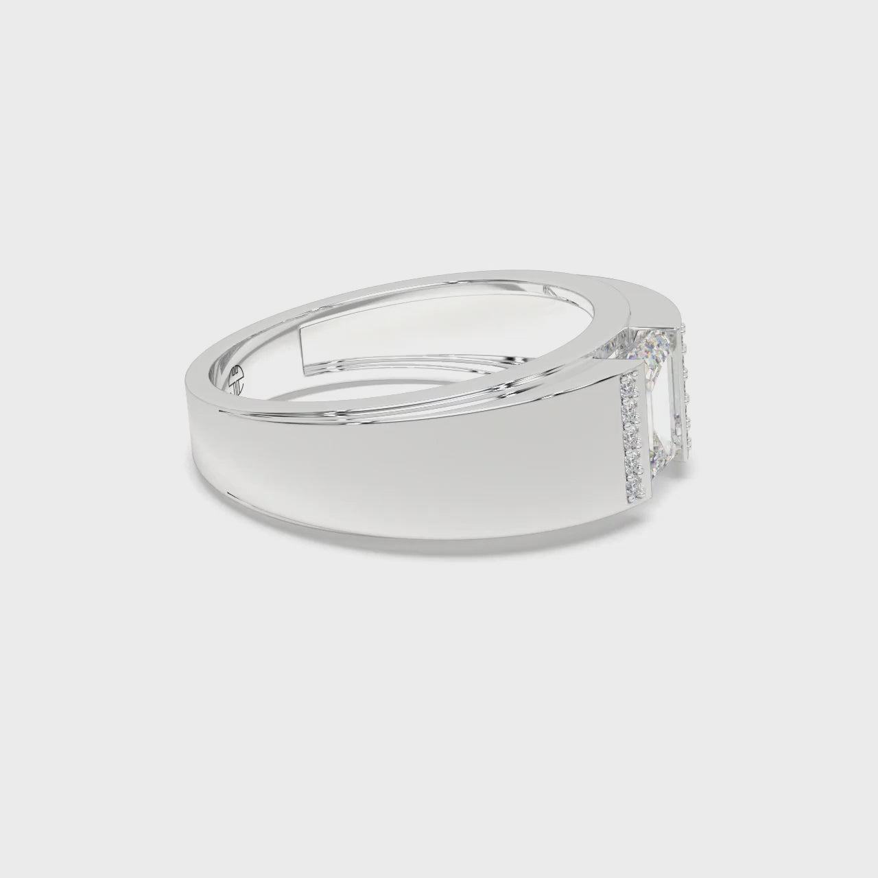 A bold declaration of strength and sophistication. At its center rests a commanding 1.1 ct emerald-cut diamond — revered for its clarity and sharp lines, echoing precision and power. Flanked by pavé-set diamonds that lend subtle brilliance, the sleek band strikes a perfect balance between modern minimalism and timeless gravitas. Crafted for the man who leads with quiet confidence, this is more than a ring — it is a symbol of presence.